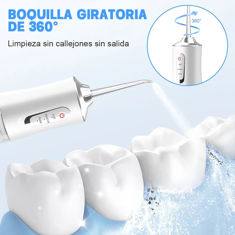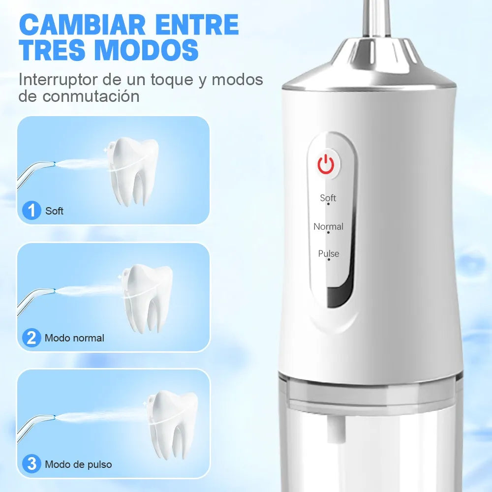 Irrigador bucal portátil y recargable, ideal para mantener una higiene dental completa en casa o de viaje.
