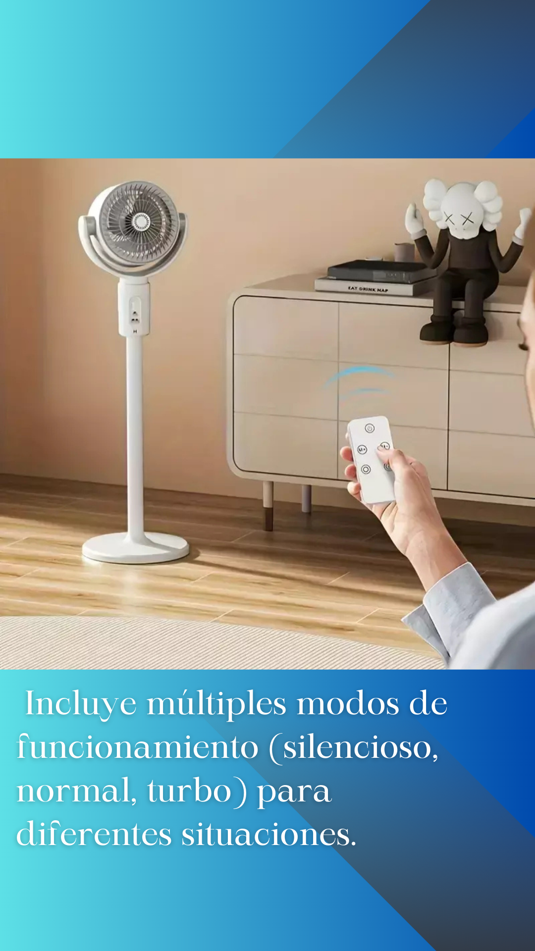 Ventilador moderno con 3 modos de velocidad y control remoto. Altura ajustable para usar en escritorio, piso u oficina. Equipado con batería recargable por USB, silencioso y potente.